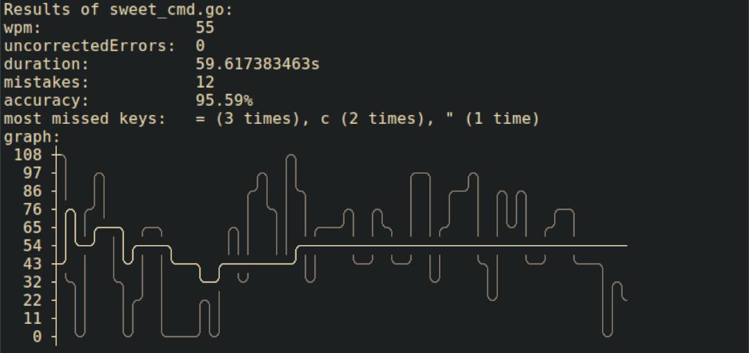 You’ll notice two lines laid on top of each other in this graph. The top line is the average words per minute throughout the exercise. The bottom is the raw words per minute (that is, words per minute without a penalty for incorrect characters) recorded at each second. While the top line gives a general trend to typing ability, the bottom line provides more granular detail about typing ability.