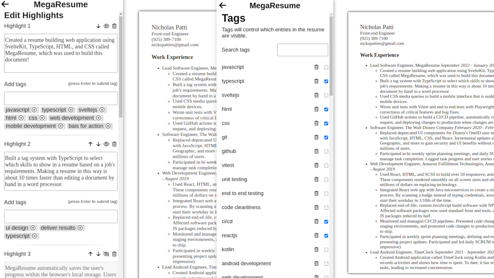 MegaResume is a resume building application which simplifies the creation of single-page resumes. By selecting specific tags, users can filter their experience and accomplishments based on a job description.