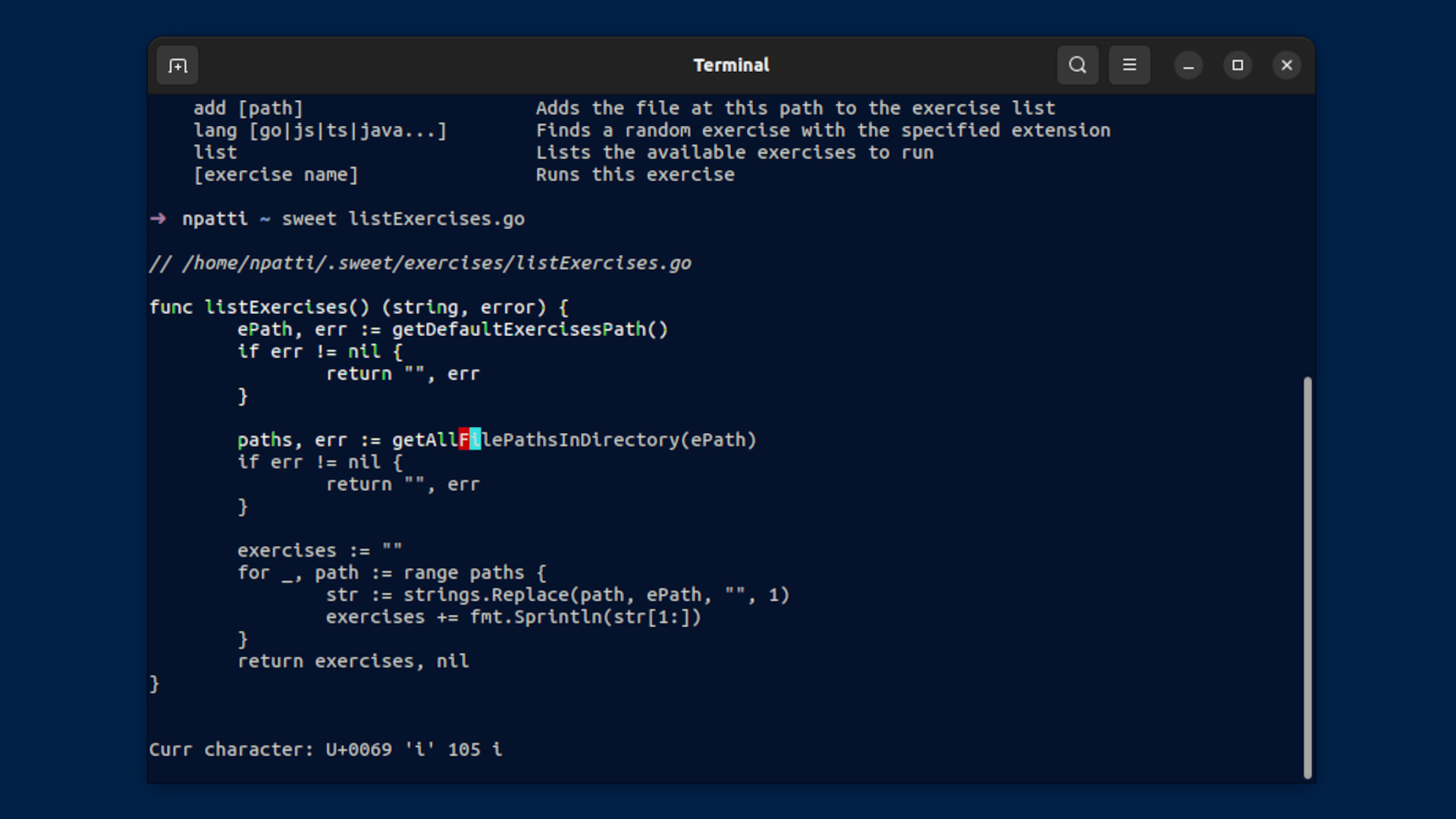 Sweet is a Software Engineering Exercise for Typing. In other words, it’s a touch typing exercise command line interface specifically designed for programmers.