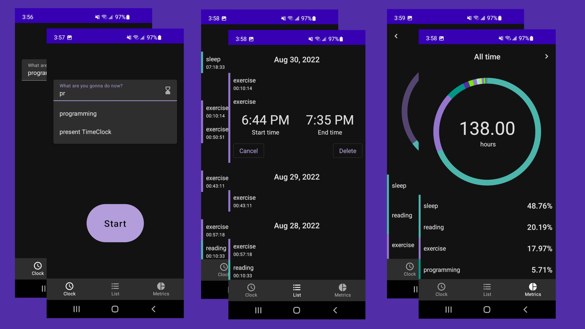 TimeClock is an Android application that helps users quickly record and analyze how they spend their time. This is my first foray into Android application development.